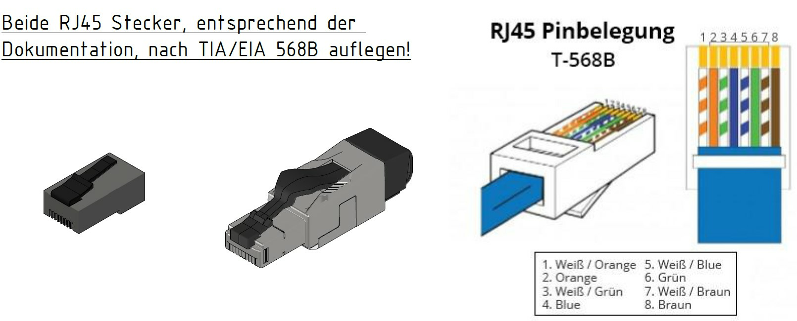 Belegung des RJ45 Steckers nach EIA/TIA 568B