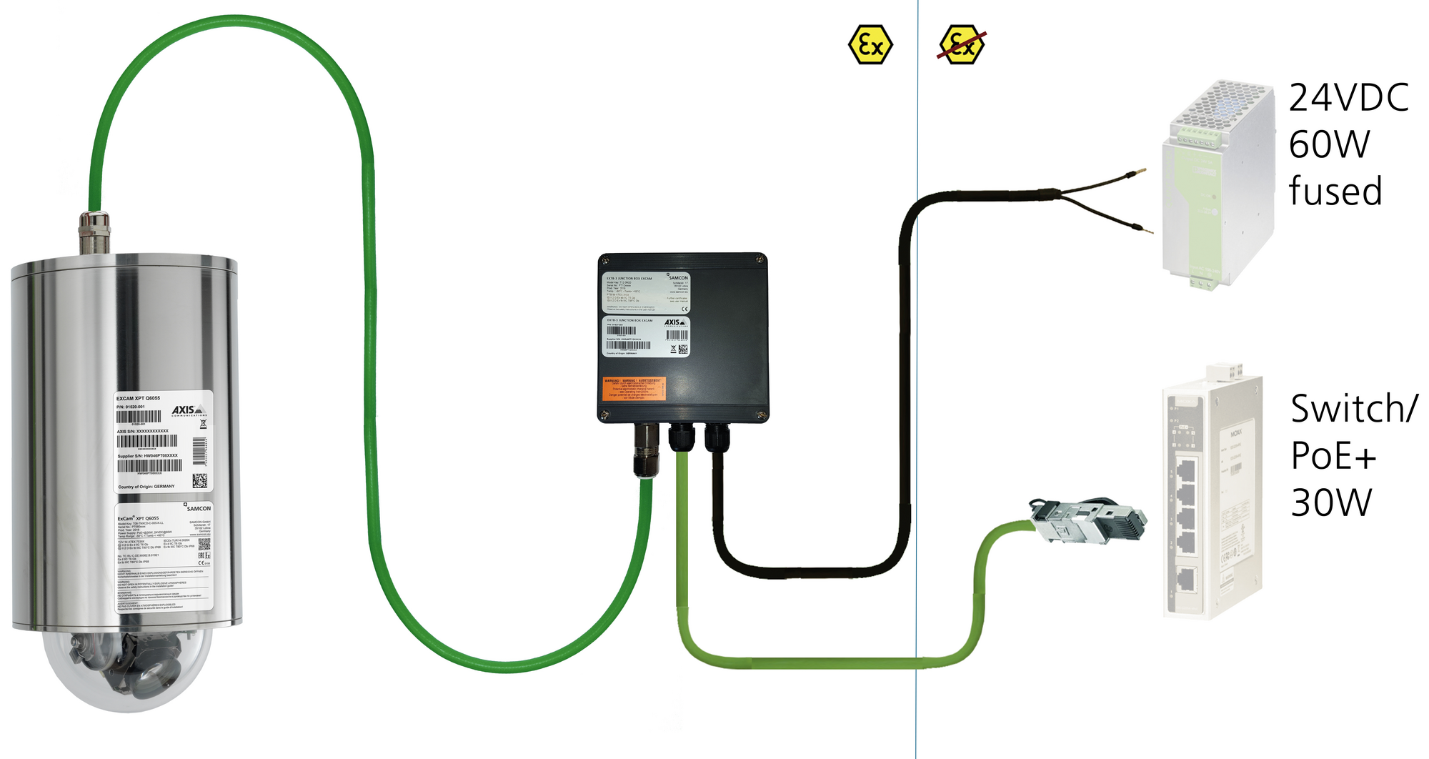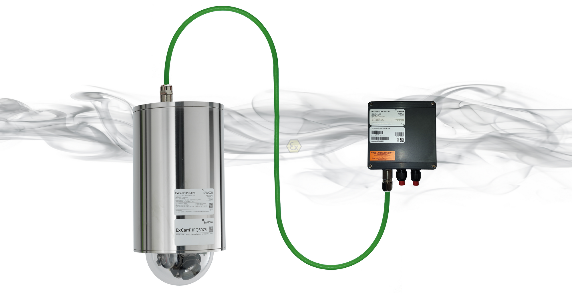 Eine Besonderheit der ExCam IPQ6075 liegt darin, dass sowohl Daten als auch die Spannungsversorgung in nur einem einzigen Kabel geführt werden können. Somit wird für den Anschluss im sicheren Bereich nur noch ein PoE-Switch oder ein PoE-Midspan benötigt. Die Stromversorgung der Kameras erfolgt per Power over Ethernet (PoE gemäß IEEE 802.3at) über das Netzwerk, die kostspielige Installation einer separaten Energie-Versorgungsleitung entfällt.