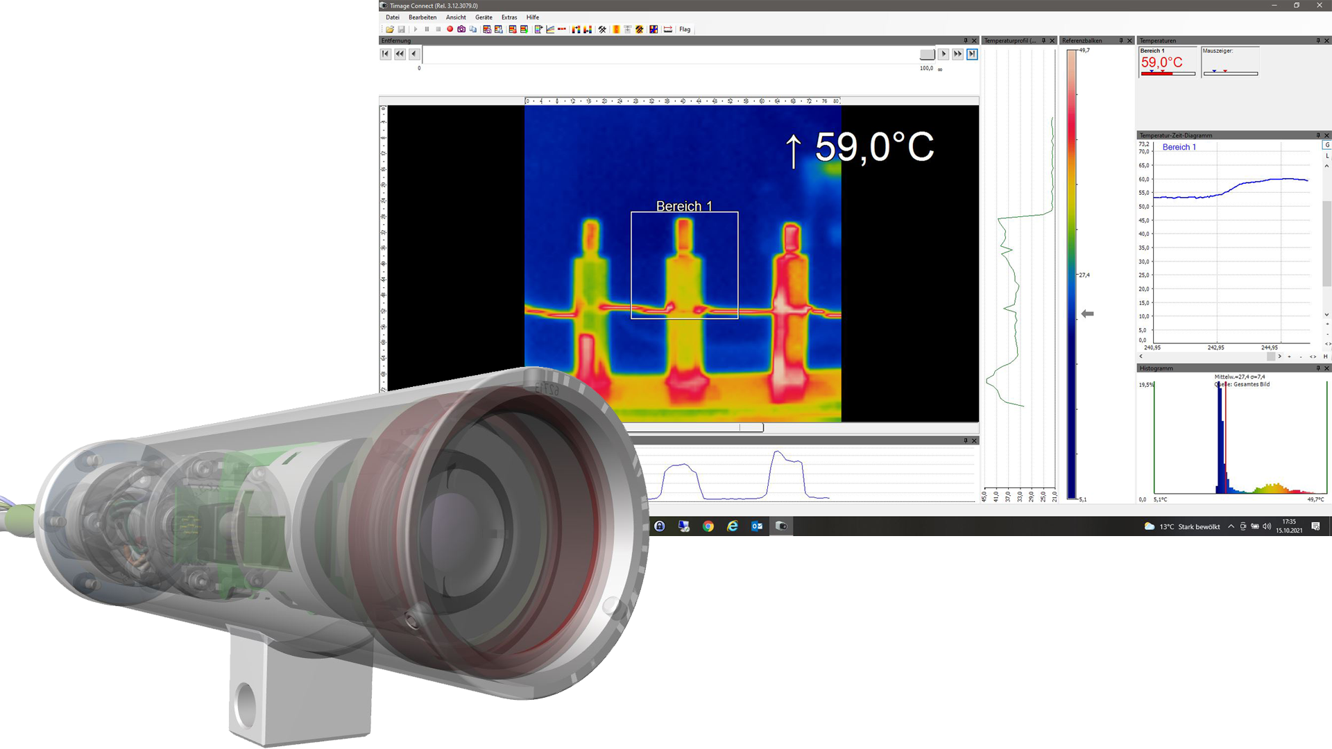 Für die umfangreiche Analysesoftware optris PIX Connect entstehen keine zusätzlichen Kosten oder Lizenzeinschränkungen. Sie wird mit der Kamera ausgeliefert und ist kompatibel mit Windows 7,8 und 10. Desweiteren sind zwei Software Development Kits (open source) für Windows und Linux enthalten. Die Bedienoberfläche der modernen Software ist intuitiv und kann ganz individuell auf Ihre spezielle Anwendung eingestellt werden. Es gibt mehrere unterschiedliche Layouts, diverse Sprachoptionen, Messfelder können beliebig angelegt, Maximal-, Minimal- und Mittelwerte können eingestellt werden. Durch die Einstellung des Emissionsgrades in unterschiedlichen Messfeldern können auch verschiedene Materialoberflächen mit einer Kamera gemessen werden. Die gemessenen Werte können als Bild, als Diagramm oder als Digitalanzeige ausgegeben oder für weitere Analysen gespeichert werden, Videosequenzen können mit allen Temperaturinformationen zu jedem einzelnen Pixel gespeichert werden. Für weitere Informationen zum Einbaumodul oder zur Software besuchen Sie gerne die optris Homepage.